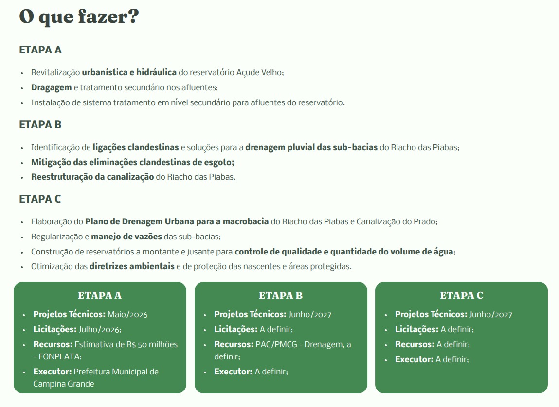 Outras duas etapas, ambas com previsão de apresentação de projetos técnicos em junho de 2027, deverão ser realizadas: a identificação de ligações clandestinas de esgoto, a reestruturação da canalização do Riacho das Piabas e a construção de reservatórios para controle da qualidade e do volume de água. Essas etapas da obra, no entanto, ainda seguem sem data para a abertura do processo licitatório.
